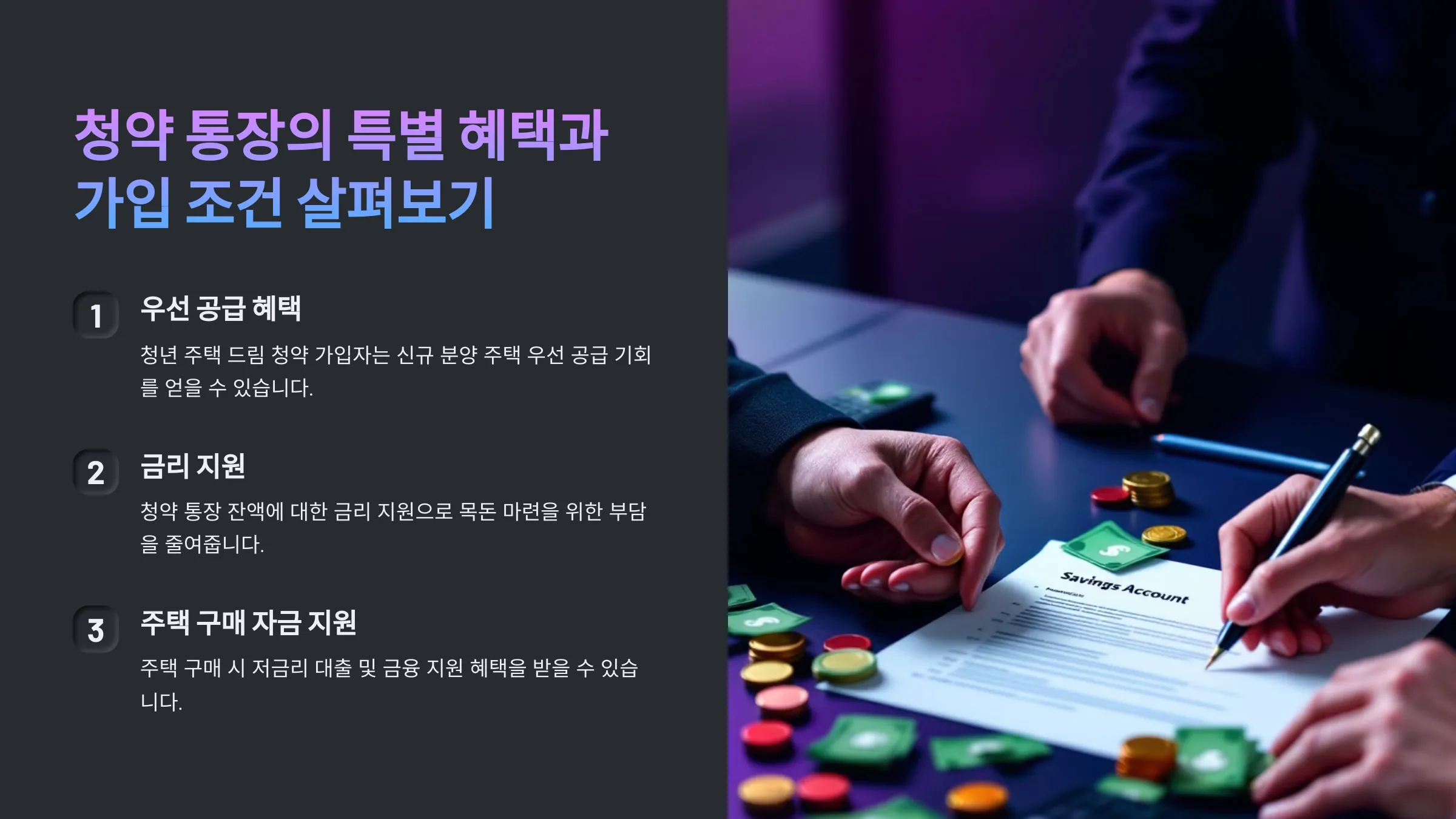 📢 **사례:** 28세 청년 C씨는 청약 통장을 3년간 유지하며 매달 10만 원을 납입했습니다. 소득 3,000만 원 이하와 무주택 기간 3년을 충족해 특별공급에 지원, 경쟁률 5:1의 공공 아파트에 당첨되었습니다. 결과적으로 시세보다 30% 낮은 가격으로 내 집 마련에 성공했습니다.